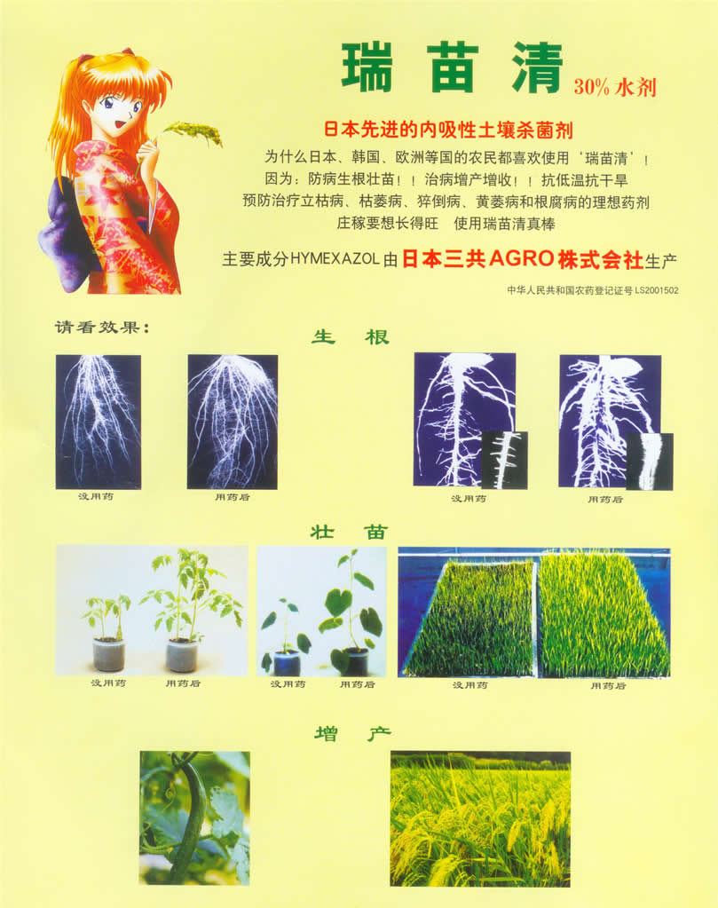 | 瑞苗清具有增產(chǎn)的作用。使用瑞苗清作物可提早成熟3—5天,并延長采收期。 |
