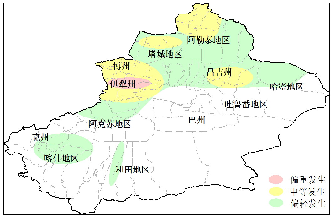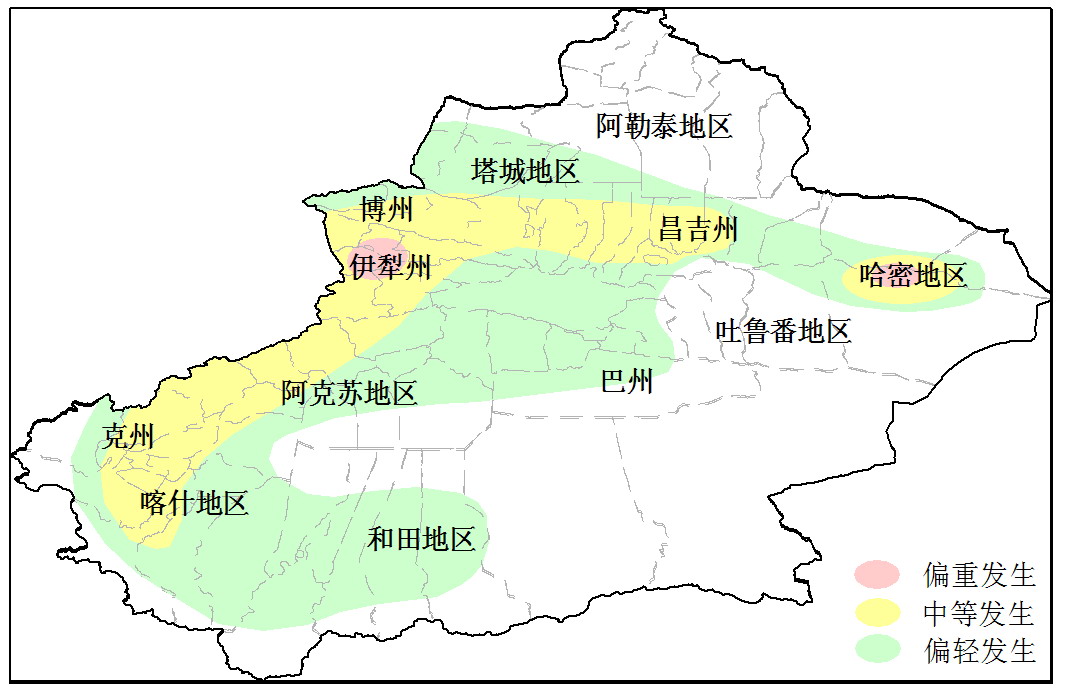 馬鈴薯病害偏輕發(fā)生(2級),發(fā)生面積10萬畝次,以馬鈴薯早疫病、晚疫病為主。伊犁、昌吉、阿勒泰是主要發(fā)生區(qū)。