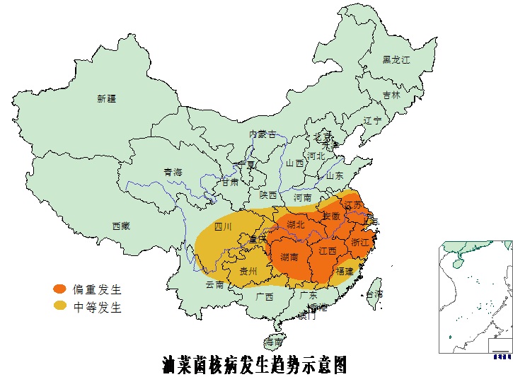 今年油菜生育期偏早,菌核病主發(fā)區(qū)菌源量大,田間子囊盤密度較高,子囊盤盛發(fā)期與油菜盛花期同步時間長,前期油菜主產區(qū)多降雨過程,田間濕度大,加之感病品種比例高,這些條件均有利于菌核病的發(fā)生為害。預計全國秋播油菜菌核病總體偏重發(fā)生,發(fā)生面積約4800萬畝。其中江南和長江中下游大部偏重發(fā)生,黃淮和西南大部中等發(fā)生。發(fā)病盛期,西南、江南、長江中下游大部為3月中下旬至4月中旬,黃淮、陜西關中為4月中旬至5月上旬。