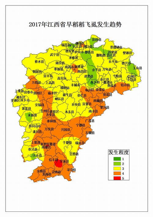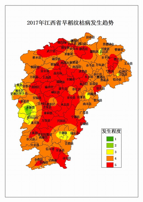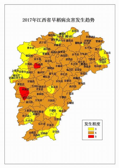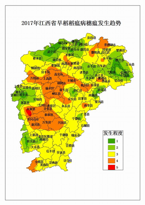 3、氣候條件。據(jù)氣象部門預(yù)測,今年汛期全省降水偏多,其中贛北、贛中偏多,贛南偏少,部分地區(qū)可能發(fā)生較為嚴(yán)重暴雨洪澇,有利于稻瘟病、紋枯病等病害的發(fā)生流行以及稻飛虱和稻縱卷葉螟的遷入繁殖為害,易誘發(fā)細(xì)菌性基腐病。