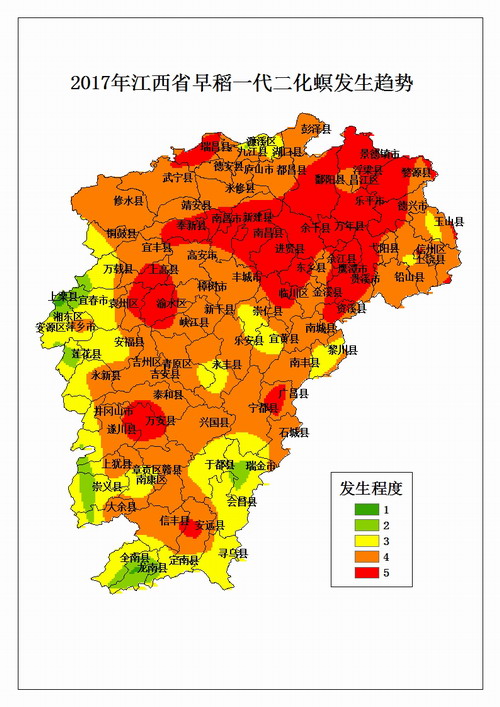 4、水稻病蟲發(fā)生的歷史資料。根據(jù)江西水稻主要病蟲害發(fā)生歷史資料分析,預(yù)計(jì)2017年二化螟、稻飛虱、稻瘟病等病蟲偏重以上發(fā)生的概率高、風(fēng)險(xiǎn)大。贛中和贛北部分地區(qū)二化螟對常用藥劑抗性水平逐年提高,重發(fā)生風(fēng)險(xiǎn)加大。