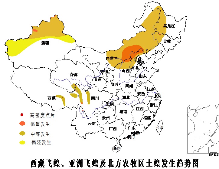 北方農(nóng)牧交錯區(qū)土蝗總體中等發(fā)生,內(nèi)蒙古中東部、陰山北麓,新疆伊犁,山西忻州、朔州、大同,河北張承地區(qū)等局部偏重發(fā)生。預(yù)計發(fā)生面積3400萬畝,達(dá)標(biāo)面積1500萬畝。大部地區(qū)出土盛期為5月中下旬,三齡盛期為6月上中旬,發(fā)生危害盛期在6月至8月。