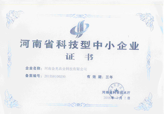 熱烈慶祝河南金光農(nóng)業(yè)科技有限公司榮獲“河南省科技型中小企業(yè)”榮譽(yù)稱號!河南省科學(xué)技術(shù)廳為我公司頒發(fā)了“河南省科技型中小企業(yè)”榮譽(yù)證書。這是我省對高新技術(shù)產(chǎn)品、科技服務(wù)型公司的最高榮譽(yù);是對我公司知識產(chǎn)權(quán)、專有技術(shù)、高新科技的充分肯定!