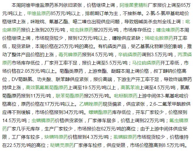 多款原藥貨源緊張價格提升