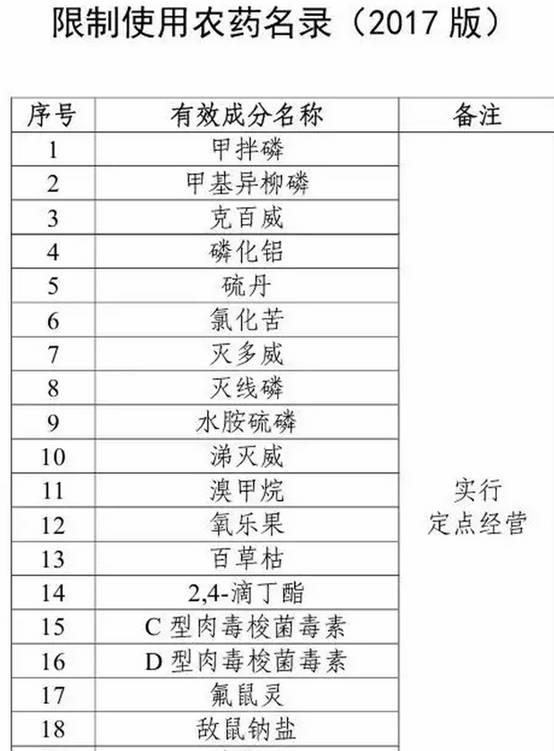 為了加強(qiáng)對(duì)限制使用農(nóng)藥的監(jiān)督管理,保障農(nóng)產(chǎn)品質(zhì)量安全和人畜安全,保護(hù)農(nóng)業(yè)生產(chǎn)和生態(tài)環(huán)境,根據(jù)《中華人民共和國食品安全法》和《農(nóng)藥管理?xiàng)l例》相關(guān)規(guī)定,我部制定了《限制使用農(nóng)藥名錄(2017版)》,現(xiàn)予公布,并就有關(guān)事項(xiàng)公告如下。