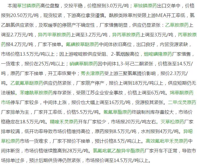 10月下旬農(nóng)藥原藥除草劑價格行情