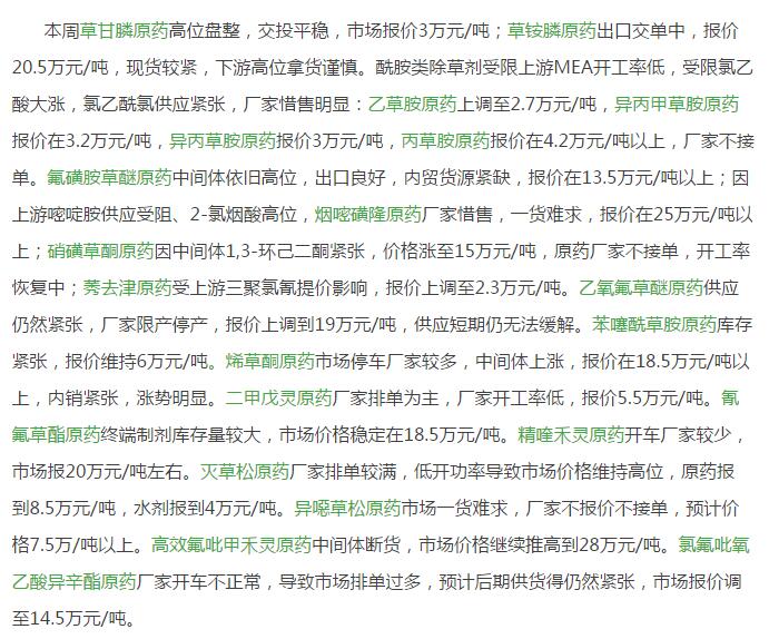 11月中期農(nóng)藥原藥除草劑市場(chǎng)行情