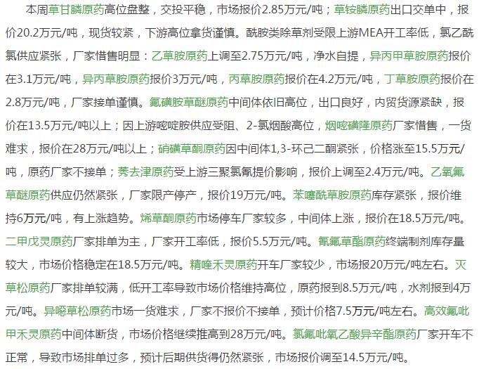 11月中期農(nóng)藥原藥除草劑市場(chǎng)行情
