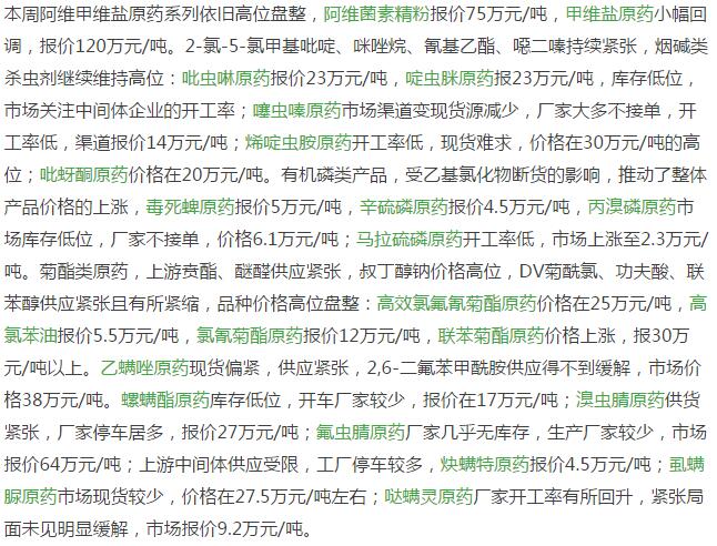 多款原藥貨源緊張價格提升