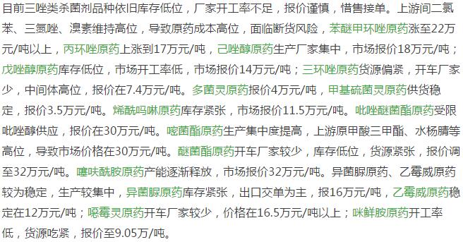 多款原藥貨源緊張價格提升