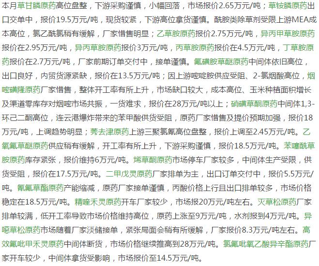 1月上旬國內農藥殺蟲劑原藥價格行情