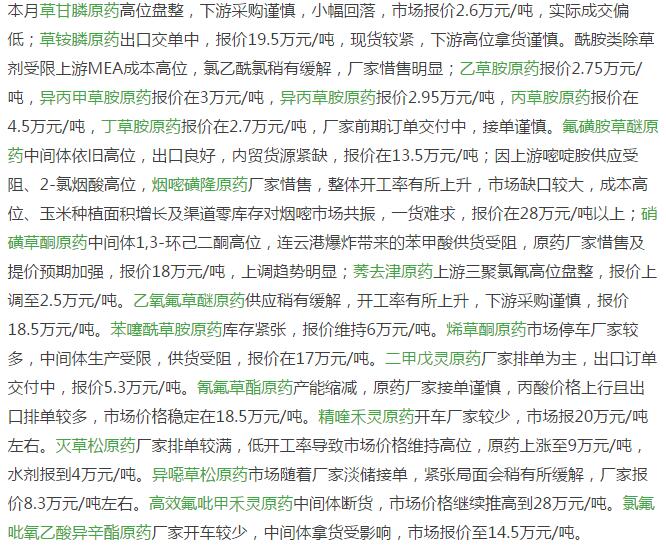 1月中旬農(nóng)藥原藥除草劑價格行情