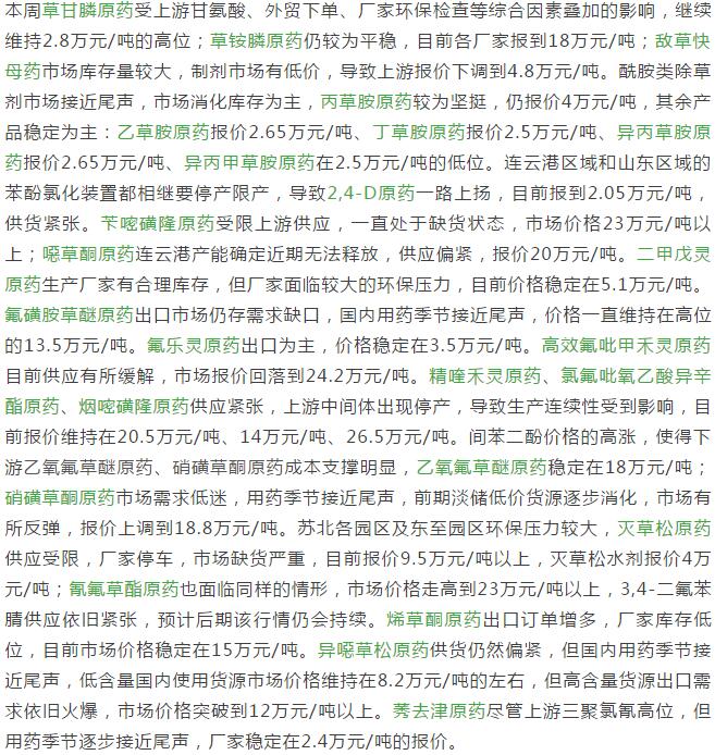 5月下旬國(guó)內(nèi)農(nóng)藥原藥除草劑價(jià)格行情