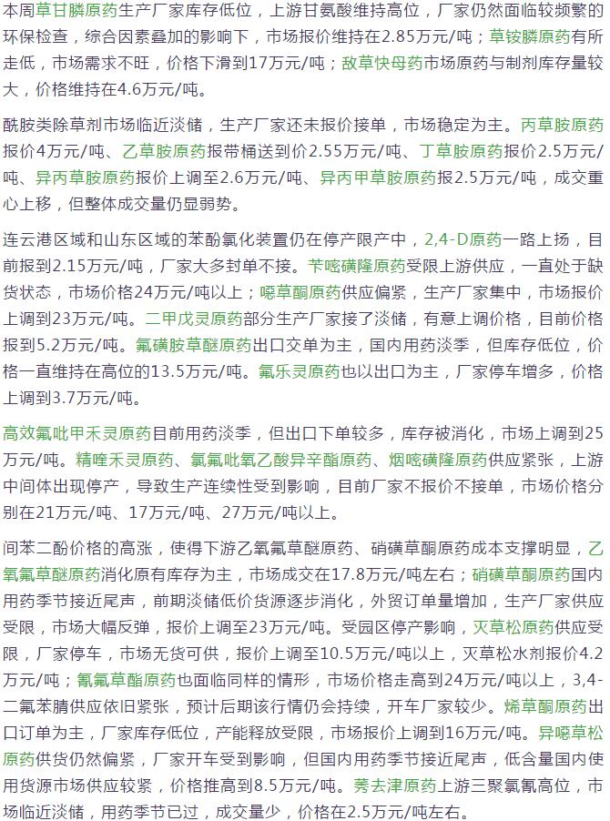 6月中旬國內(nèi)農(nóng)藥原藥除草劑價格行情