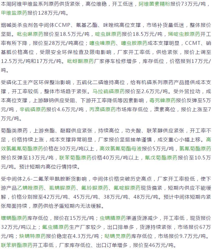 多款原藥貨源緊張價格提升