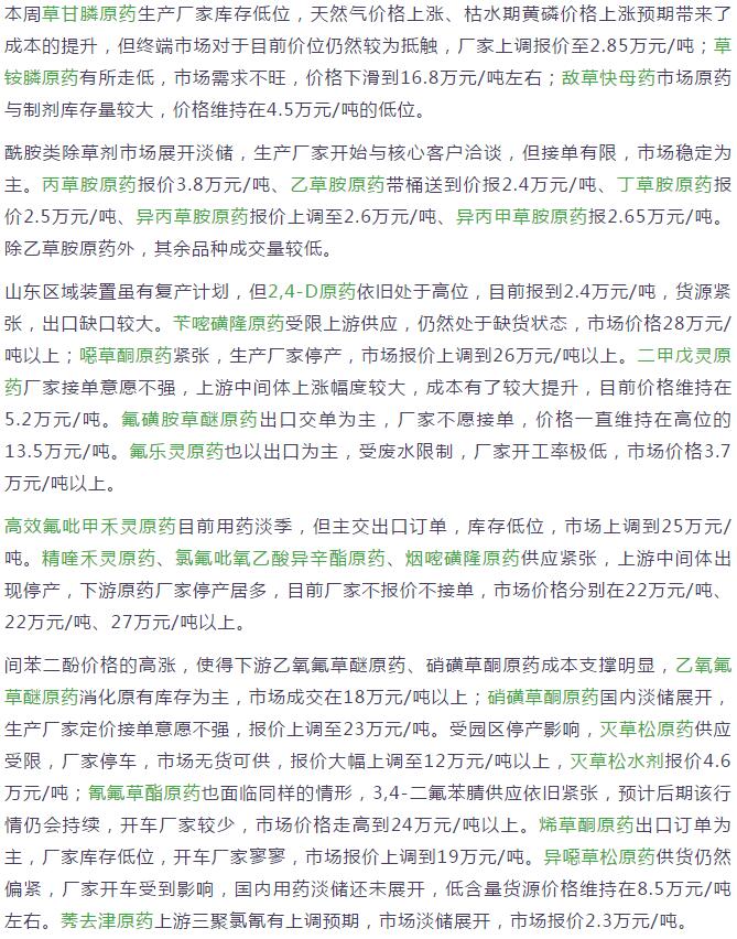 8月末國(guó)內(nèi)農(nóng)藥原藥除草劑市場(chǎng)行情走勢(shì)