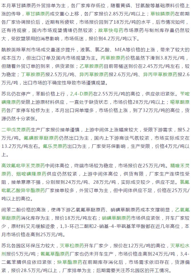10月下旬國(guó)內(nèi)農(nóng)藥原藥除草劑價(jià)格走勢(shì)