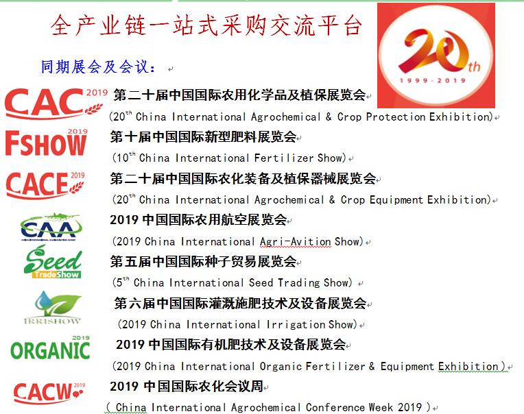 同期將在N1、N2、N3、N4、N5、N6、N7、N8、E7館舉辦第二十屆中國國際農(nóng)用化學(xué)品及植保展覽會(CAC 2019)。同期還將繼續(xù)舉辦“中國國際肥料發(fā)展與貿(mào)易論壇”。