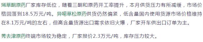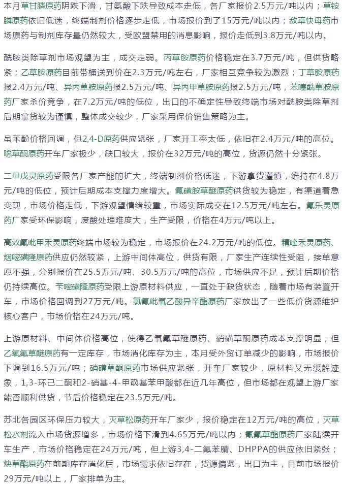 12月末國(guó)內(nèi)農(nóng)藥原藥除草劑價(jià)格走勢(shì)