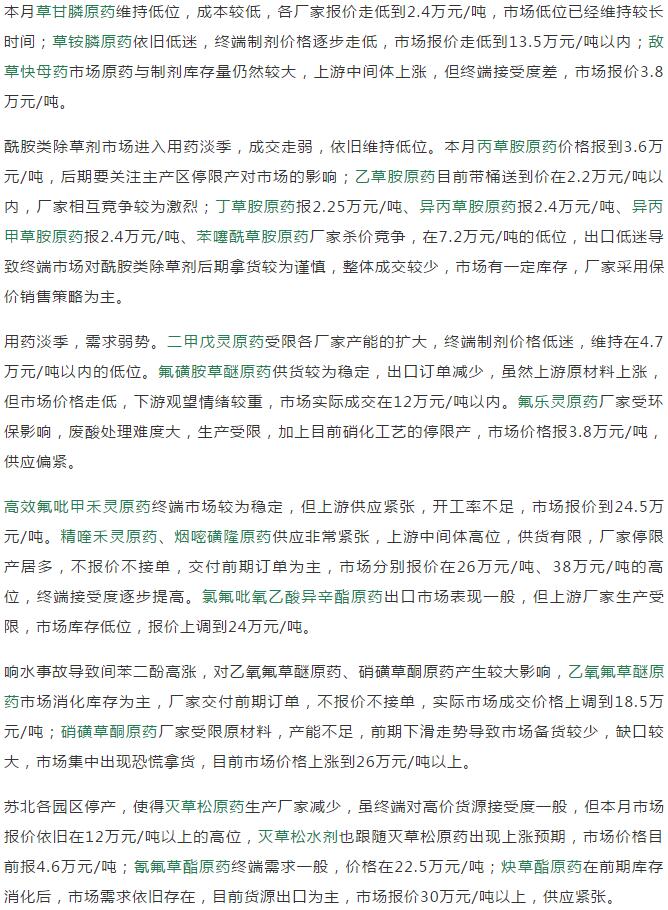 19年5月底國(guó)內(nèi)農(nóng)藥原藥除草劑價(jià)格走勢(shì)