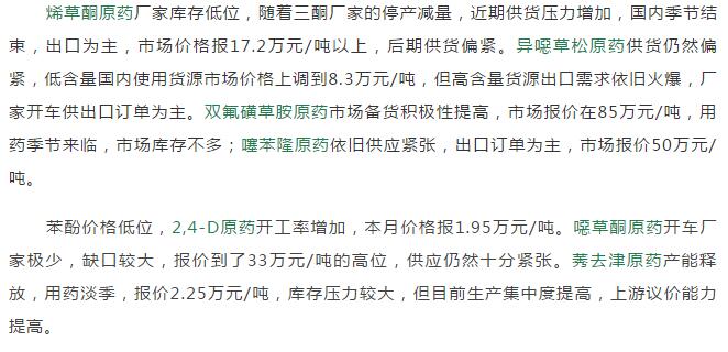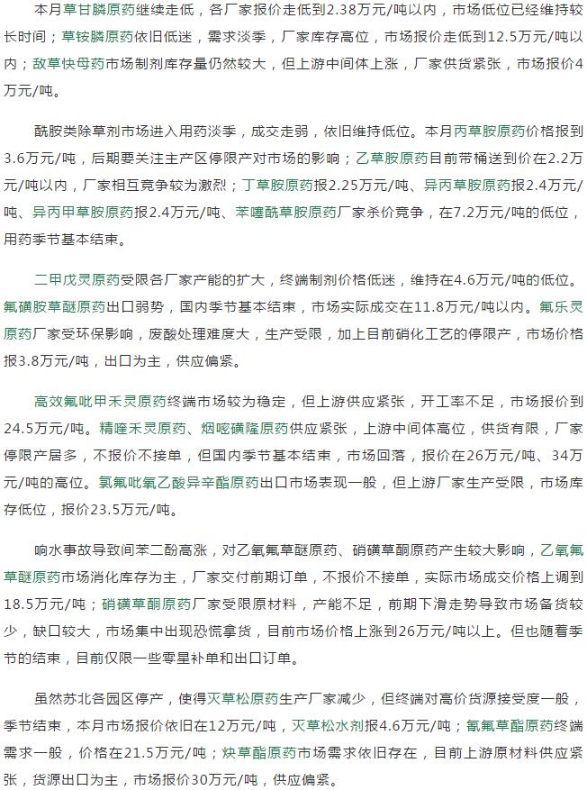 2019年5月中旬國內(nèi)農(nóng)藥原藥除草劑價格走勢
