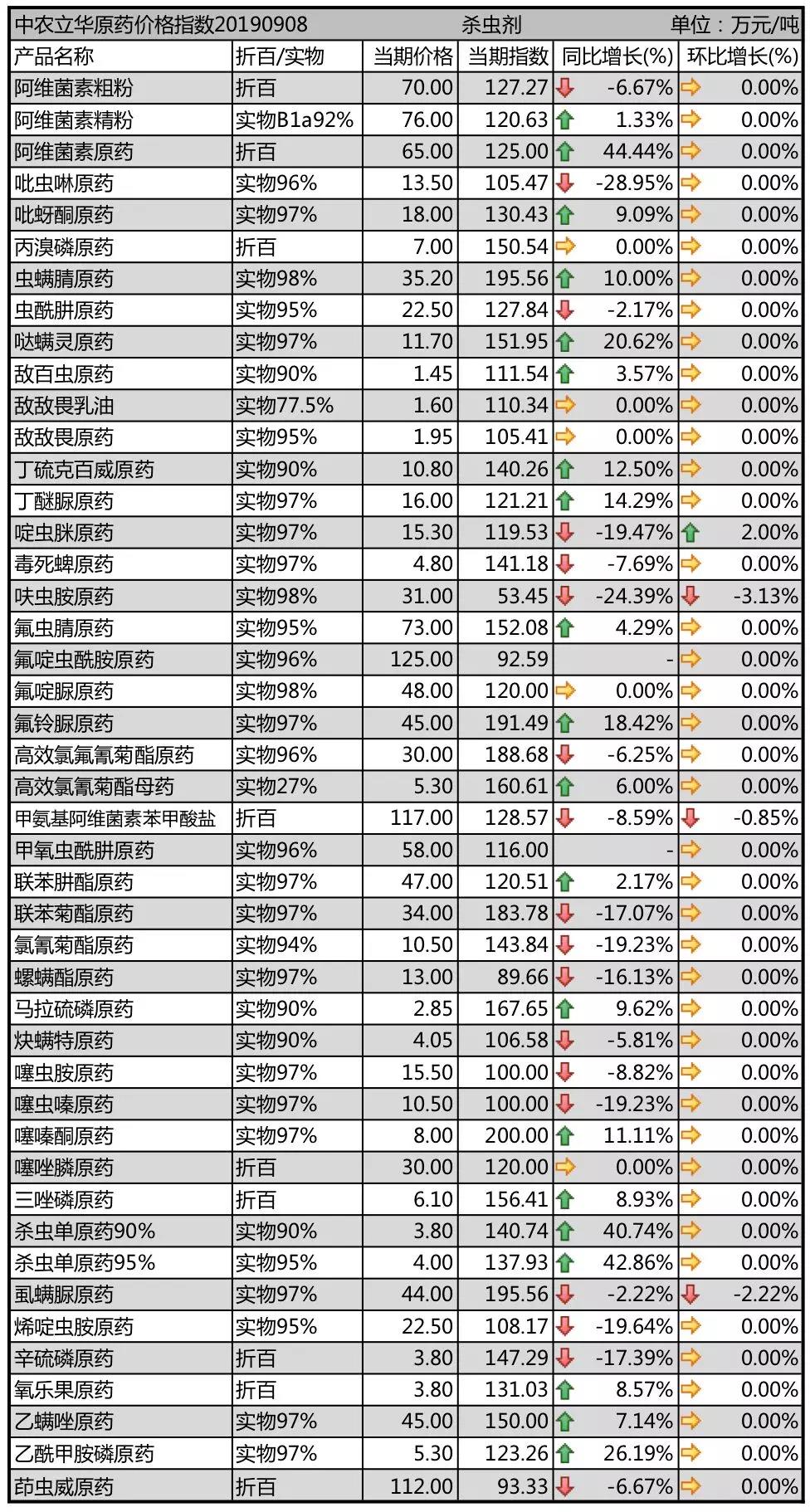 噠螨靈原藥開車廠家極少,市場貨源極其有限,報價到了11.7萬元/噸;螺螨酯原藥、炔螨特原藥等分別報到13萬元/噸、4.05萬元/噸,市場淡季需求較少。