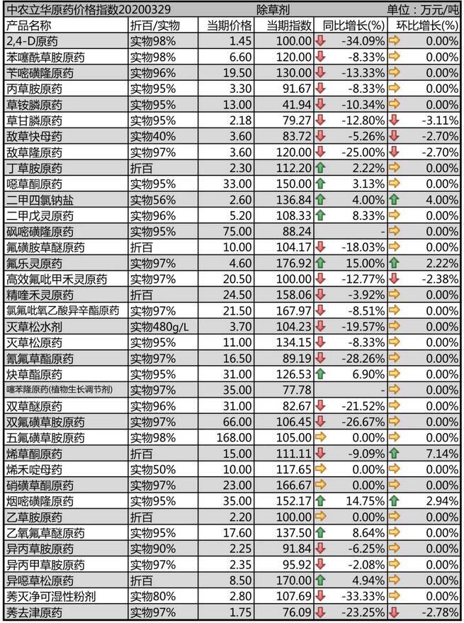 2,4-D原藥庫存減少,廠家排單增多,本月價格報1.45萬元/噸。噁草酮原藥開車廠家極少,出口訂單缺口較大,報價在33萬元/噸的高位,供應(yīng)仍然十分緊張。莠去津原藥備貨展開,廠家?guī)齑孑^大,報價下調(diào)至1.75萬元/噸。