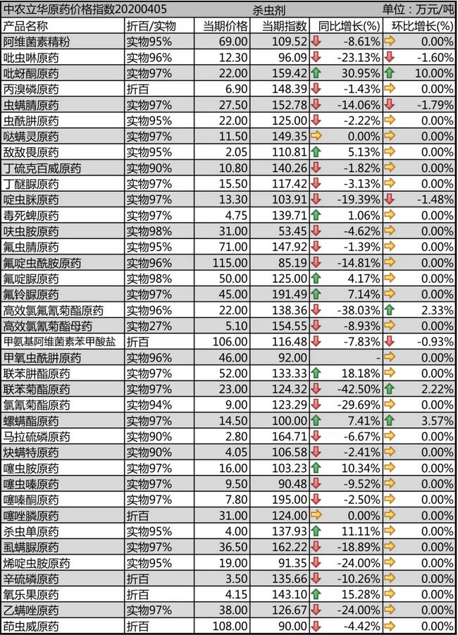 噠螨靈原藥開工率回升,供應(yīng)穩(wěn)定,報價11.5萬元/噸;螺螨酯原藥、炔螨特原藥等用藥季節(jié)到來,價格上漲,分別報到14.5萬元/噸、4.05萬元/噸,庫存較低,供貨偏緊;茚蟲威原藥需求增多,庫存減少,市場價格在108萬元/噸。