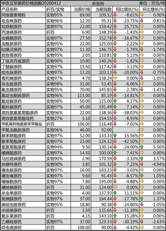 噠螨靈原藥開(kāi)工率回升,供應(yīng)穩(wěn)定,報(bào)價(jià)11.5萬(wàn)元/噸;螺螨酯原藥供應(yīng)緊張,排單較多,市場(chǎng)流通價(jià)格上漲到14.5萬(wàn)元/噸;炔螨特原藥近期開(kāi)工率提升,報(bào)價(jià)到了3.85萬(wàn)元/噸;茚蟲(chóng)威原藥需求增多,庫(kù)存減少,市場(chǎng)價(jià)格在108萬(wàn)元/噸。