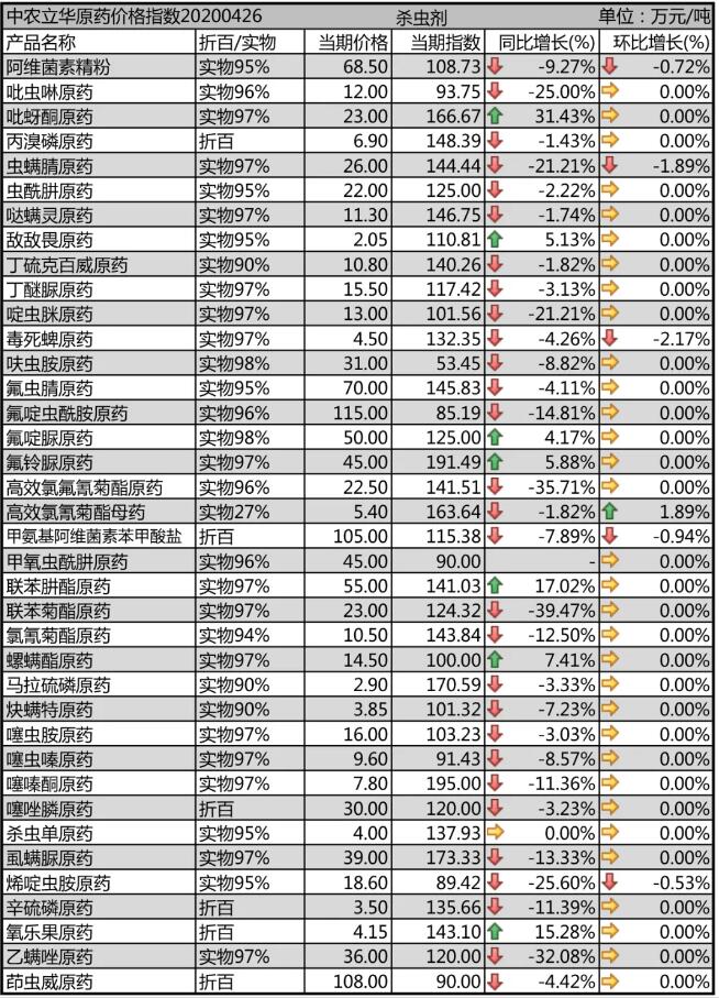 噠螨靈原藥開工率回升,供應穩(wěn)定,報價11.3萬元/噸;螺螨酯原藥供應緊張,排單較多,市場流通價格上漲到14.5萬元/噸;炔螨特原藥近期開工率提升,報價到了3.85萬元/噸;茚蟲威原藥需求增多,庫存減少,市場價格在108萬元/噸。