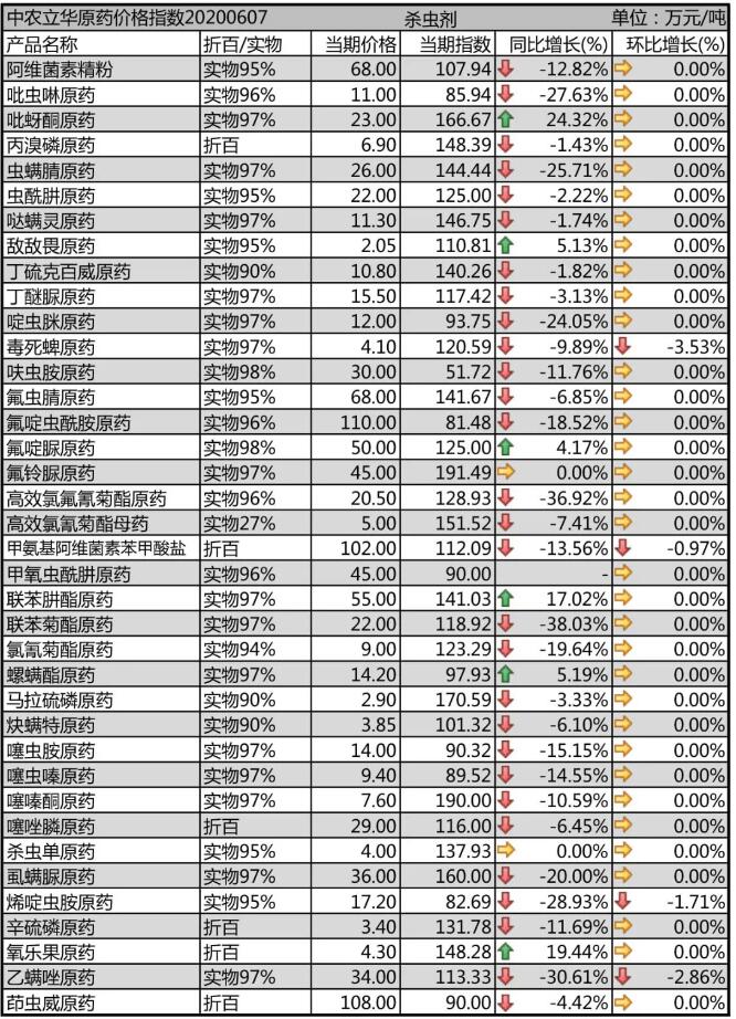 馬拉硫磷原藥受蝗災(zāi)出口訂單增多的影響,市場(chǎng)依舊在2.9萬(wàn)元/噸的高位;丙溴磷原藥穩(wěn)定在6.9萬(wàn)元/噸;毒死蜱原藥出口減量,開工率增加,價(jià)格回調(diào)到4.1萬(wàn)元/噸;辛硫磷原藥需求弱勢(shì),下調(diào)報(bào)價(jià)3.4萬(wàn)元/噸。