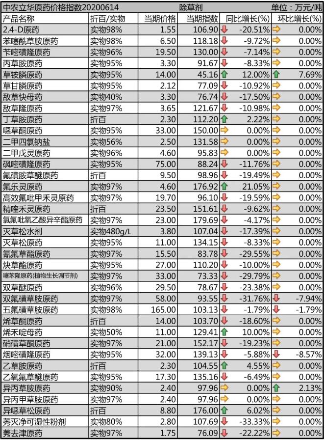 2,4-D原藥庫存減少,廠家排單增多,本月價格穩(wěn)定在1.55萬元/噸。噁草酮原藥開車廠家極少,出口訂單缺口較大,報價在33萬元/噸的高位,供應仍然十分緊張。莠去津原藥廠家?guī)齑孑^大,報價1.75萬元/噸。