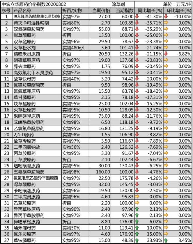 滅草松原藥用藥季節(jié)后期,生產(chǎn)產(chǎn)能集中,市場報價10.5萬元/噸,滅草松水劑市場報價3.6萬元/噸,供應(yīng)較前期有所緩解;氰氟草酯原藥用藥季節(jié)已過,該產(chǎn)品是后期市場競爭的一個前期樣本,市場報價15.5萬元/噸以內(nèi);炔草酯原藥上游原材料供應(yīng)情況有所緩解,價格有所回落,廠家爭奪淡儲訂單,市場報價到25萬元/噸。