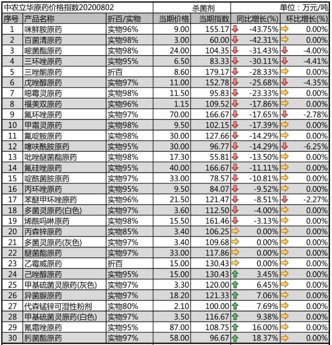 多菌靈原藥、甲基硫菌靈原藥生產(chǎn)廠家環(huán)保壓力較大,開工率一般,市場報價在3.5-3.6萬元/噸;噁霉靈原藥市場價格報至11.5萬元/噸,需求弱勢;氟啶胺原藥生產(chǎn)廠家集中,市場觀望情緒較重,目前價格下滑至30萬元/噸;咪鮮胺原藥開工率提升,但市場需求進(jìn)入淡季,價格大幅殺跌,報到9萬元/噸。