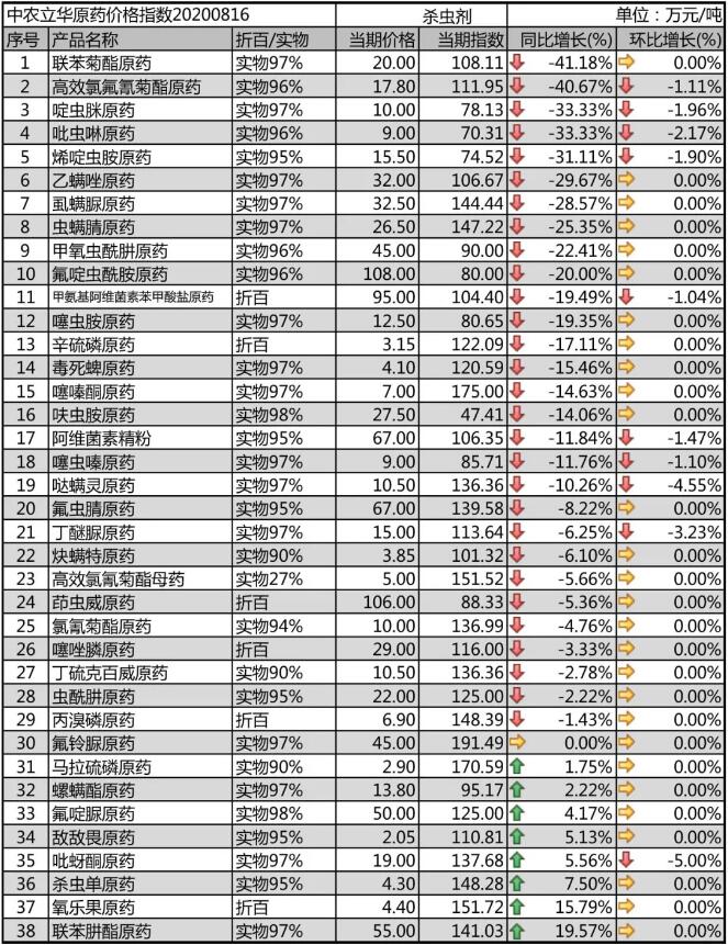 噠螨靈原藥供應(yīng)穩(wěn)定,報(bào)價(jià)10.5萬元/噸;螺螨酯原藥市場流通價(jià)格報(bào)13.8萬元/噸,較為穩(wěn)定;炔螨特原藥市場需求減弱,市場報(bào)價(jià)3.85萬元/噸;茚蟲威原藥需求增多,庫存減少,市場價(jià)格穩(wěn)定在106萬元/噸。