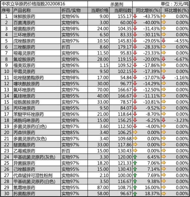多菌靈原藥、甲基硫菌靈原藥生產(chǎn)廠家環(huán)保壓力較大,開工率一般,市場報價在3.5-3.6萬元/噸;噁霉靈原藥市場價格報至11.5萬元/噸,需求弱勢;氟啶胺原藥生產(chǎn)廠家集中,市場觀望情緒較重,目前價格下滑至28萬元/噸;咪鮮胺原藥開工率提升,但市場需求進入淡季,價格維持低位,報到9萬元/噸。