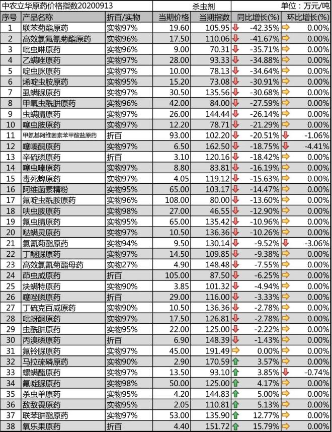 馬拉硫磷原藥受蝗災(zāi)影響,出口為主,市場(chǎng)報(bào)價(jià)依舊處于2.9萬(wàn)元/噸的高位;丙溴磷原藥穩(wěn)定在6.9萬(wàn)元/噸,毒死蜱原藥出口訂單平穩(wěn),進(jìn)入市場(chǎng)淡季,本月報(bào)到4.05萬(wàn)元/噸,辛硫磷原藥傳統(tǒng)用藥淡季,目前報(bào)3.1萬(wàn)元/噸。