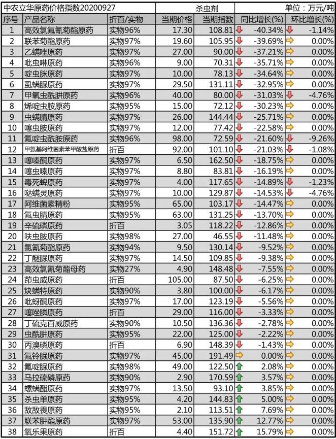 噠螨靈原藥供應(yīng)穩(wěn)定,報(bào)價(jià)10萬(wàn)元/噸;螺螨酯原藥市場(chǎng)流通價(jià)格報(bào)13.5萬(wàn)元/噸,較為穩(wěn)定;炔螨特原藥市場(chǎng)需求減弱,市場(chǎng)報(bào)價(jià)3.85萬(wàn)元/噸;茚蟲(chóng)威原藥需求增多,庫(kù)存減少,市場(chǎng)價(jià)格穩(wěn)定在105萬(wàn)元/噸。
