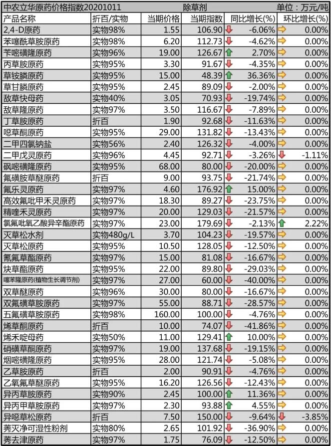 烯草酮原藥新增產(chǎn)能較多,期貨價格遠低于現(xiàn)貨價格,目前價格回落至10萬元/噸以內(nèi),出口為主,預(yù)計后期廠家競爭加劇,仍將維持低位。異噁草松原藥廠家開始接淡儲訂單,國內(nèi)市場低含量貨源價格維持在7.5萬元/噸。雙氟磺草胺原藥市場競爭加劇,價格回落至55萬元/噸以內(nèi),市場處于觀望狀態(tài);噻苯隆原藥市場報價27萬元/噸,需求弱勢,消化庫存為主;砜嘧磺隆原藥需求弱勢,市場報價68萬元/噸,出口為主。