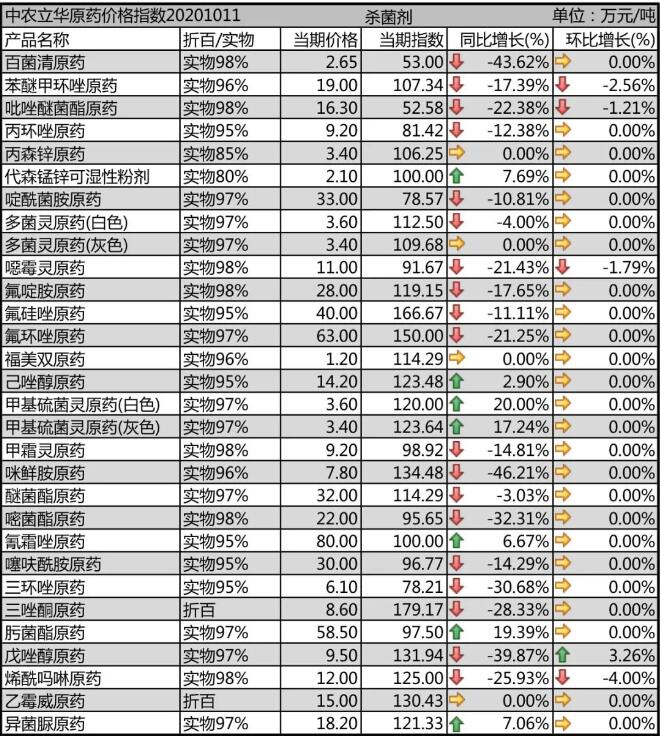 多菌靈原藥、甲基硫菌靈原藥生產(chǎn)廠家環(huán)保壓力較大,開工率一般,市場報(bào)價3.6萬元/噸,甲托供應(yīng)緊張;噁霉靈原藥市場價格報(bào)至11萬元/噸,需求弱勢;氟啶胺原藥生產(chǎn)廠家集中,市場觀望情緒較重,目前價格下滑至28萬元/噸;咪鮮胺原藥開工率提升,但市場需求進(jìn)入淡季,價格下行,報(bào)到7.8萬元/噸。
