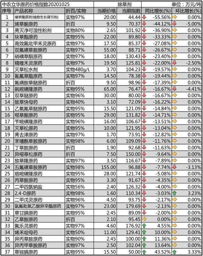 烯草酮原藥新增產(chǎn)能較多,期貨價格遠(yuǎn)低于現(xiàn)貨價格,目前價格回落至9.5萬元/噸,出口為主,預(yù)計后期廠家競爭加劇,仍將維持低位。異噁草松原藥廠家開始接淡儲訂單,國內(nèi)市場低含量貨源價格維持在7.5萬元/噸。雙氟磺草胺原藥市場競爭加劇,價格回落至55萬元/噸以內(nèi),市場處于觀望狀態(tài);噻苯隆原藥市場報價20萬元/噸,價格大幅下行,現(xiàn)有產(chǎn)能阻止新增產(chǎn)能的一個策略;砜嘧磺隆原藥需求弱勢,市場報價65萬元/噸,出口為主。