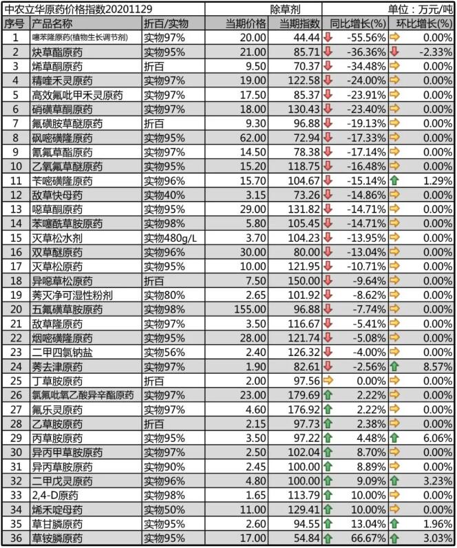 滅草松原藥市場啟動,但廠家開工延后,還未釋放產(chǎn)量,市場庫存較少,市場報價10萬元/噸,滅草松水劑市場報價3.7萬元/噸,目前高品質(zhì)貨源供應(yīng)依舊偏緊;氰氟草酯原藥前期廠家低價淡儲訂單已經(jīng)停止接單,但市場庫存低位,給后期供應(yīng)帶來了一定風險,目前市場報價14.5萬元/噸;炔草酯原藥上游原材料供應(yīng)情況依舊不太明朗,用藥季節(jié)已過,市場報價下行到21萬元/噸。