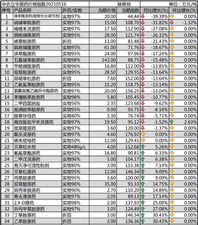 受出口需求增加的影響,草甘膦原藥持續(xù)上調報價,目前報價4萬元/噸,期單已經(jīng)排到10月份,達到近幾年高位,預計后期仍會維持高位;草銨膦原藥目前供應依舊緊張,產(chǎn)能還未得到釋放,出口需求依舊良好,目前報價到18.5萬元/噸;敵草快母藥出口訂單為主,原材料持續(xù)上漲,高位疊加出口增量,市場報到3.3萬元/噸。