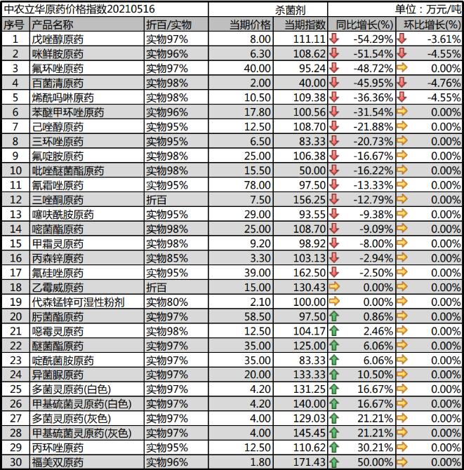 多菌靈原藥生產(chǎn)廠家環(huán)保壓力較大,開工率一般,庫存低位,市場報價維持在4.2萬元/噸;甲基硫菌靈原藥成本壓力大,市場價格報到4.2萬元/噸;噁霉靈原藥市場價格報至12.5萬元/噸,供應偏緊,但需求未得到提升;氟啶胺原藥終端用藥量減少,市場觀望情緒較重,目前價格下滑至25萬元/噸;咪鮮胺原藥消化庫存為主,季節(jié)后期,市場價格報到6.3萬元/噸。