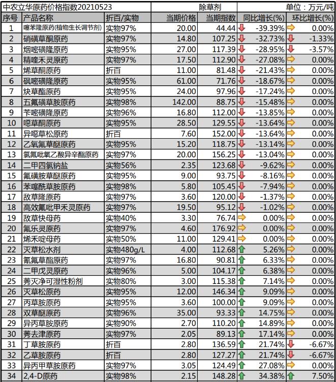 2,4-D原藥原材料持續(xù)上漲,帶動了成本上行,開工率不足導致供應(yīng)緊張,本月價格報到2.15萬元/噸。噁草酮原藥開工廠家增多,出口為主,報價穩(wěn)定在28.5萬元/噸。莠去津原藥廠家報到2.05萬元/噸。