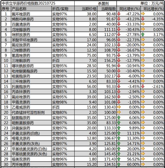 多菌靈原藥生產(chǎn)廠家環(huán)保壓力較大,市場(chǎng)報(bào)價(jià)維持在4萬元/噸;甲基硫菌靈原藥成本壓力大,市場(chǎng)價(jià)格報(bào)到4.2萬元/噸;噁霉靈原藥市場(chǎng)價(jià)格報(bào)至12.8萬元/噸,開工率低,供應(yīng)偏緊;氟啶胺原藥終端用藥量減少,市場(chǎng)觀望情緒較重,目前價(jià)格下滑至24萬元/噸;咪鮮胺原藥庫(kù)存低位,淡儲(chǔ)關(guān)注度逐漸升溫,市場(chǎng)價(jià)格有所反彈,報(bào)到6.5萬元/噸。