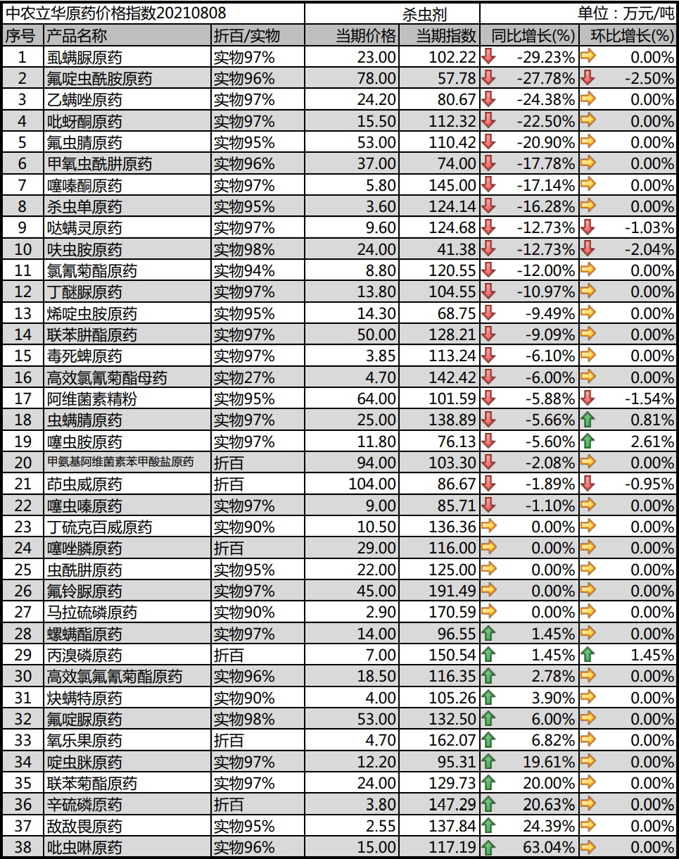 噠螨靈原藥供應(yīng)穩(wěn)定,報價9.6萬元/噸;螺螨酯原藥市場流通價格報14萬元/噸,供應(yīng)穩(wěn)定;炔螨特原藥市場需求一般,但庫存消化,市場報價上漲到4萬元/噸;茚蟲威原藥需求啟動,開工率偏低,市場庫存低位,目前價格穩(wěn)定在104萬元/噸。