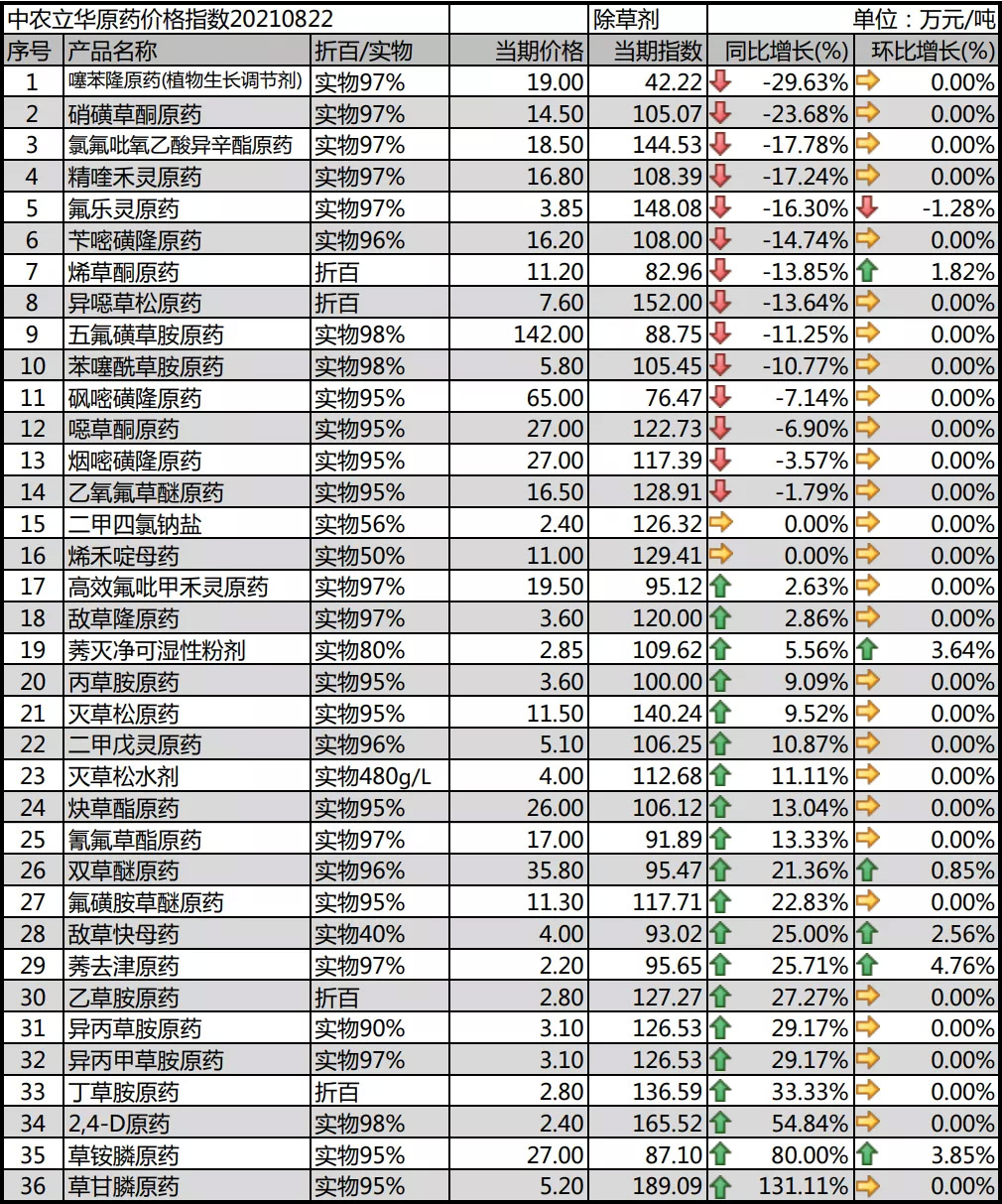 滅草松原藥廠家開工不順暢,新上產(chǎn)能還未釋放產(chǎn)量,市場(chǎng)庫(kù)存較少,市場(chǎng)報(bào)價(jià)11.5萬元/噸,滅草松水劑市場(chǎng)報(bào)價(jià)4萬元/噸,市場(chǎng)庫(kù)存偏少;氰氟草酯原藥進(jìn)入用藥淡季,上游原材料高位,市場(chǎng)報(bào)價(jià)維持在17萬元/噸;炔草酯原藥市場(chǎng)同樣受到此影響,疊加三氯吡啶的上漲,成本大幅上行,市場(chǎng)報(bào)價(jià)在26萬元/噸;高效氟吡甲禾靈原藥也受到上游原材料大幅上行影響,市場(chǎng)上行到19.5萬元/噸。