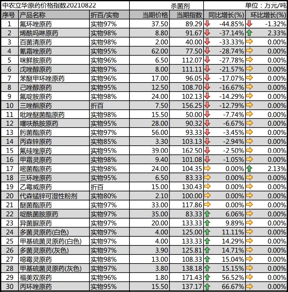 三唑類(lèi)產(chǎn)品市場(chǎng)受開(kāi)工率影響較大,上游三氮唑的上漲給了較大成本壓力:苯醚甲環(huán)唑原藥目前穩(wěn)中走低,供應(yīng)增加,市場(chǎng)價(jià)格報(bào)17萬(wàn)元/噸;丙環(huán)唑原藥廠(chǎng)家忙于交付前期訂單,成本高位,開(kāi)工率不足,價(jià)格上漲到15.5萬(wàn)元/噸;己唑醇原藥市場(chǎng)供應(yīng)增加,價(jià)格報(bào)到12.5萬(wàn)元/噸;戊唑醇原藥較為穩(wěn)定,目前報(bào)到8萬(wàn)元/噸;三環(huán)唑原藥廠(chǎng)家開(kāi)工率低,基礎(chǔ)原材料上漲帶來(lái)了成本壓力,市場(chǎng)價(jià)格報(bào)到6.5萬(wàn)元/噸;氟環(huán)唑原藥市場(chǎng)開(kāi)工率提升,流通貨源價(jià)格下滑到37.5萬(wàn)元/噸,隨著價(jià)格下行,終端制劑的性?xún)r(jià)比提升。