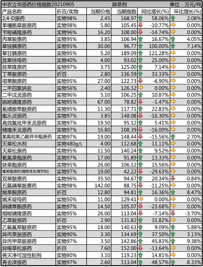受原材料高位、環(huán)保督查影響產(chǎn)能下降預(yù)期,國(guó)際市場(chǎng)需求良好,國(guó)內(nèi)逐漸進(jìn)入備貨窗口期,草甘膦原藥維持高位,目前報(bào)價(jià)5.2萬(wàn)元/噸以上,貨源偏緊,廠家接單意愿不強(qiáng),預(yù)計(jì)后期仍會(huì)維持高位;草銨膦原藥目前供應(yīng)依舊緊張,出口為主,開(kāi)工率依舊不足,內(nèi)貿(mào)需求因價(jià)格高位有所減量,目前報(bào)到30萬(wàn)元/噸;敵草快母藥原材料持續(xù)上漲,成本高位疊加出口增量,價(jià)格也緊跟其他品種之后,報(bào)到萬(wàn)4萬(wàn)元/噸。